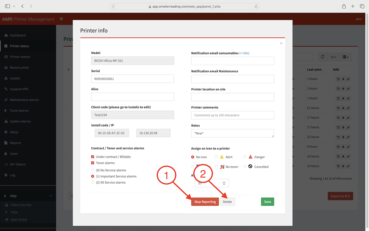 Important: The "Stop Reporting" command is linked to the printer’s IP address. If you issue this command to an IP address that has a new printer connected (e.g., 192.168.1.200), the new printer will stop reporting instead of the old one.
