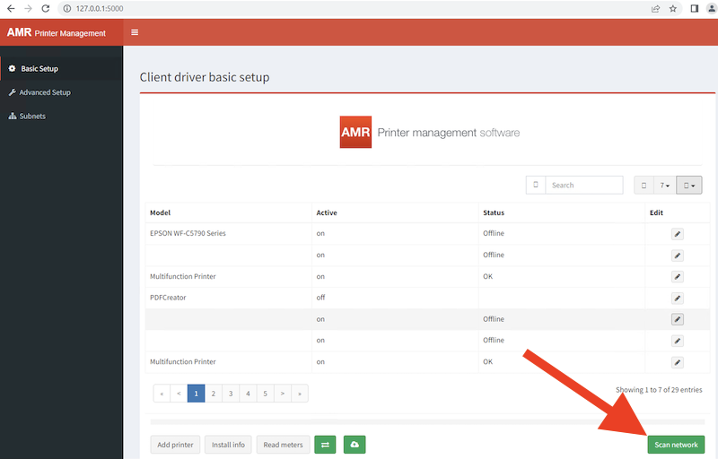 Una vez instalado, aparecerá esta pantalla mientras hace un scaner de red en busca de impresoras contactadas en red. Pulsa Scan network si no se ha iniciado solo.