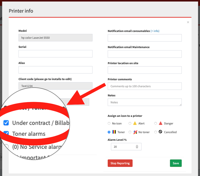 No. Si los contadores de color y negro estan a cero, la impresora no reportará. Necesita tener el contador al menos a 1 para poder reportar correctamente. Simplemente imprime una copia en color y una en negro. En la próxima lectura la impresora reportará.
